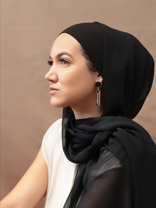 The underscarf (made from viscose lycra) is attached to the one side of the chiffon scarf, allowing you to slip on the scarf and style as desired with minimal pins. Perfect for turbans and hijab styles as well. The design of the undercap means less chance of scarf fiascos! Who wouldn’t want that???